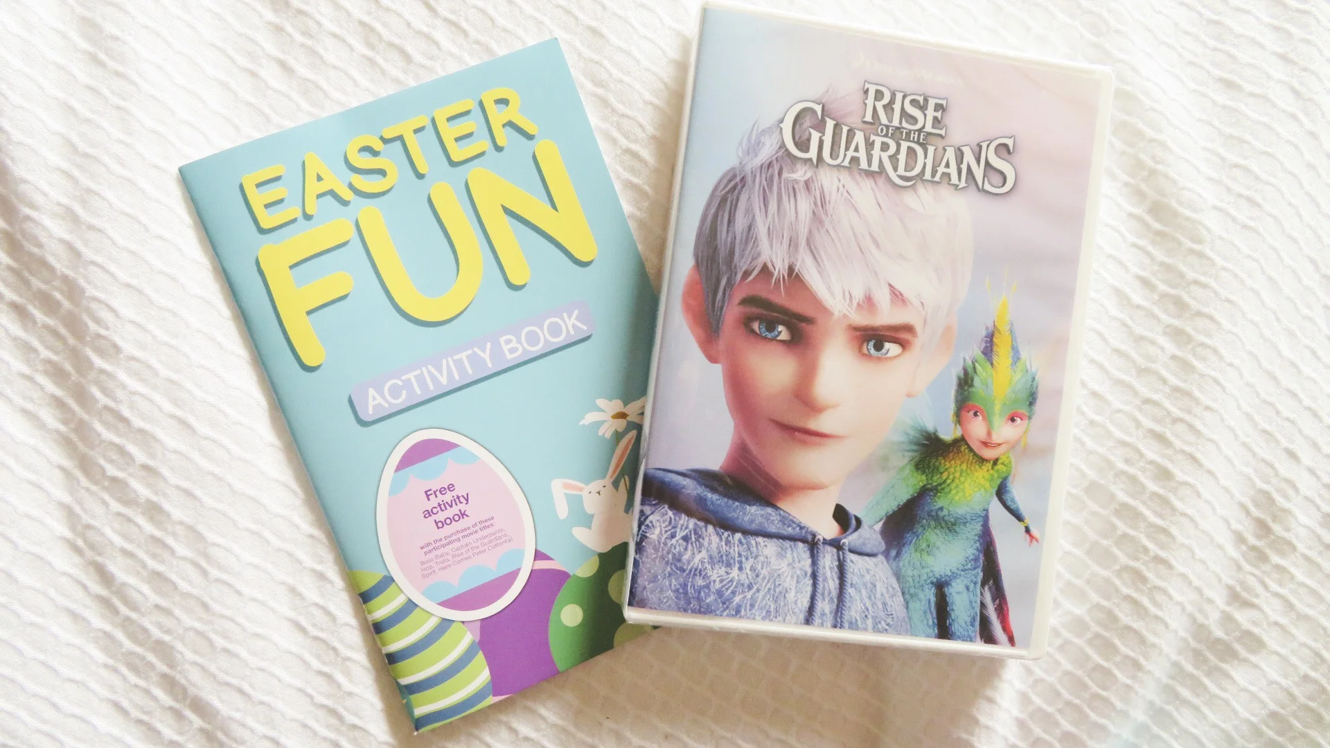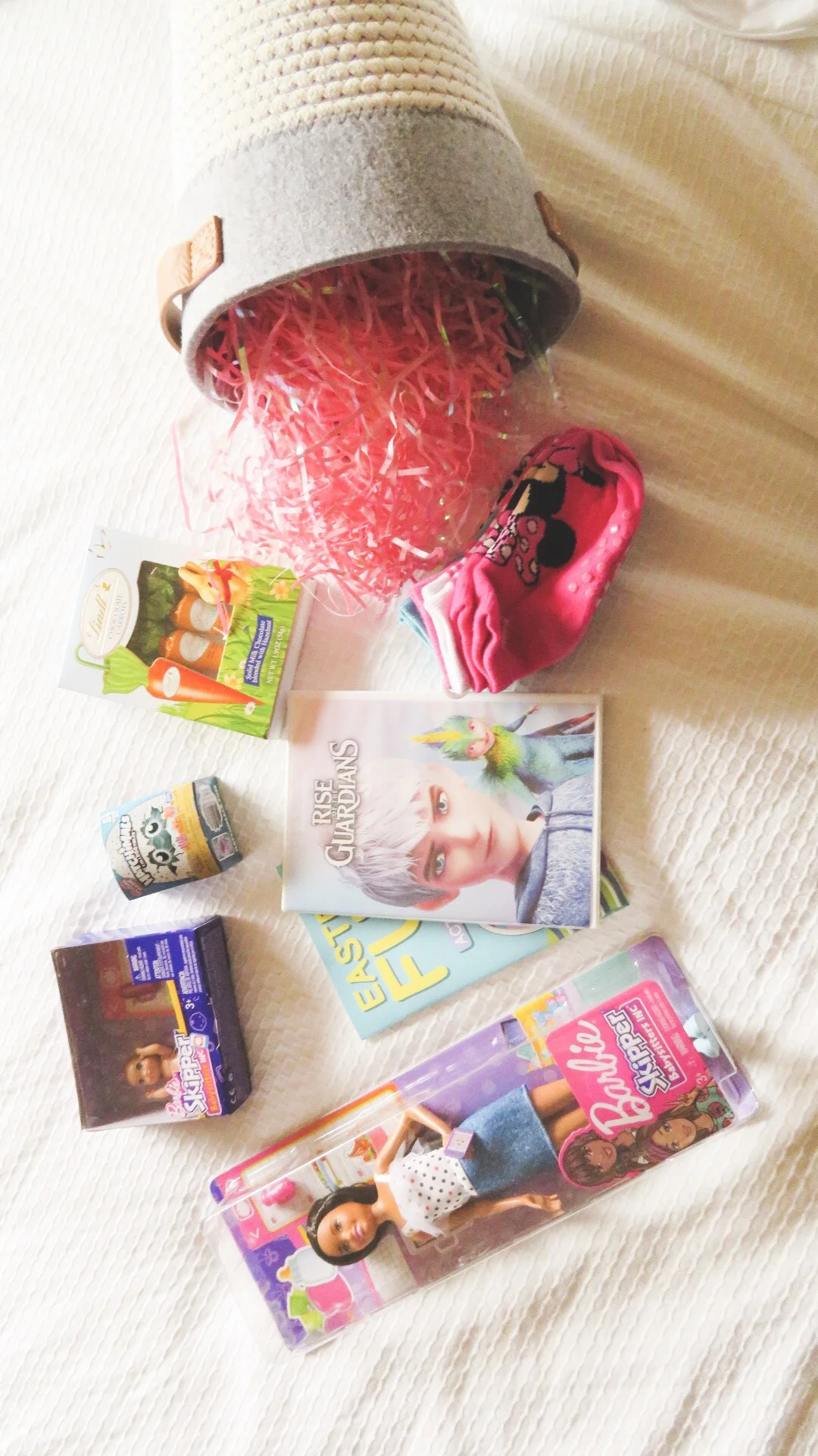 Belle’s basket contains a Skipper Barbie doll and a baby, a movie, an activity book, a mini Hatchimals toy, new socks, and a small box of chocolates. I. chose to get Belle the movie “Rise of the Guardians” because it’s one of our favorites. It even came with a free activity book at Target.