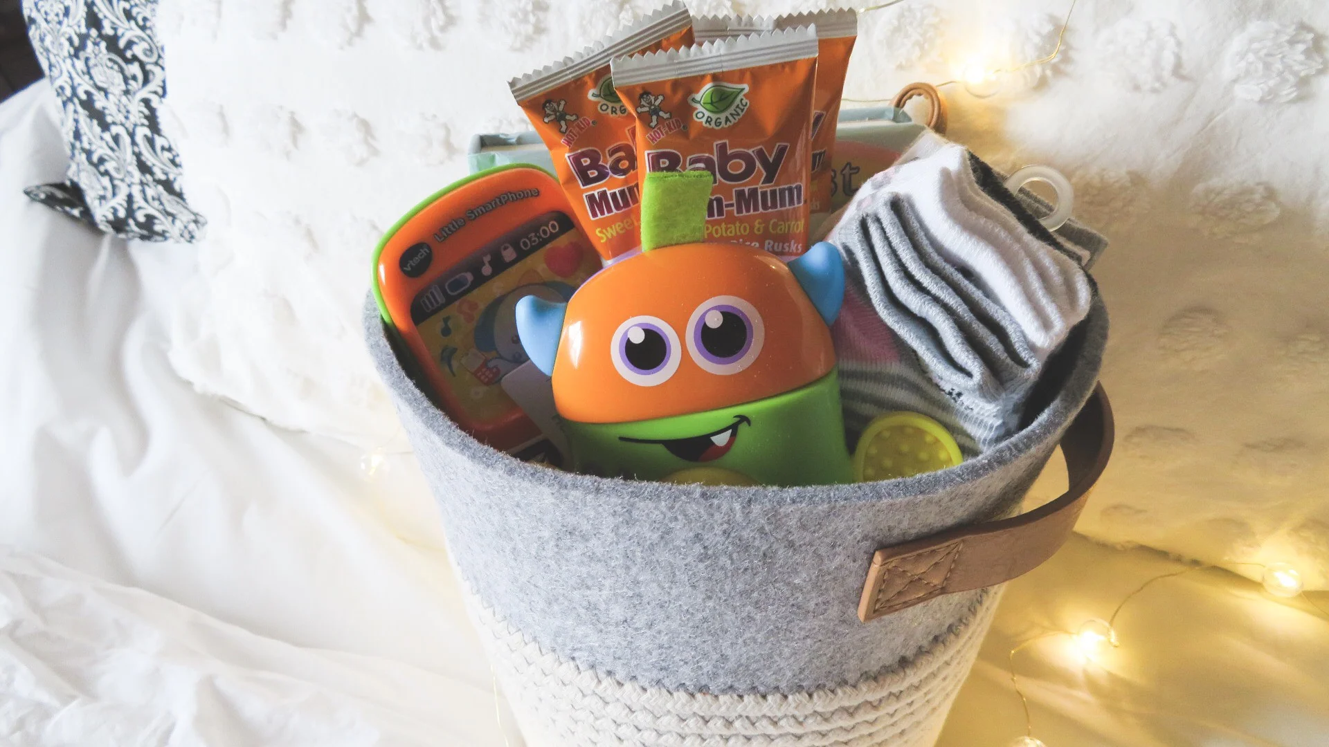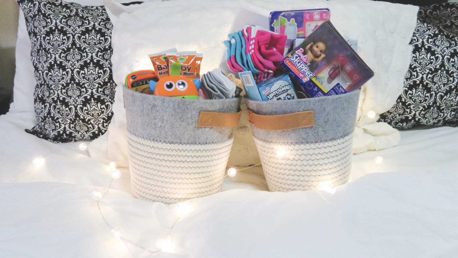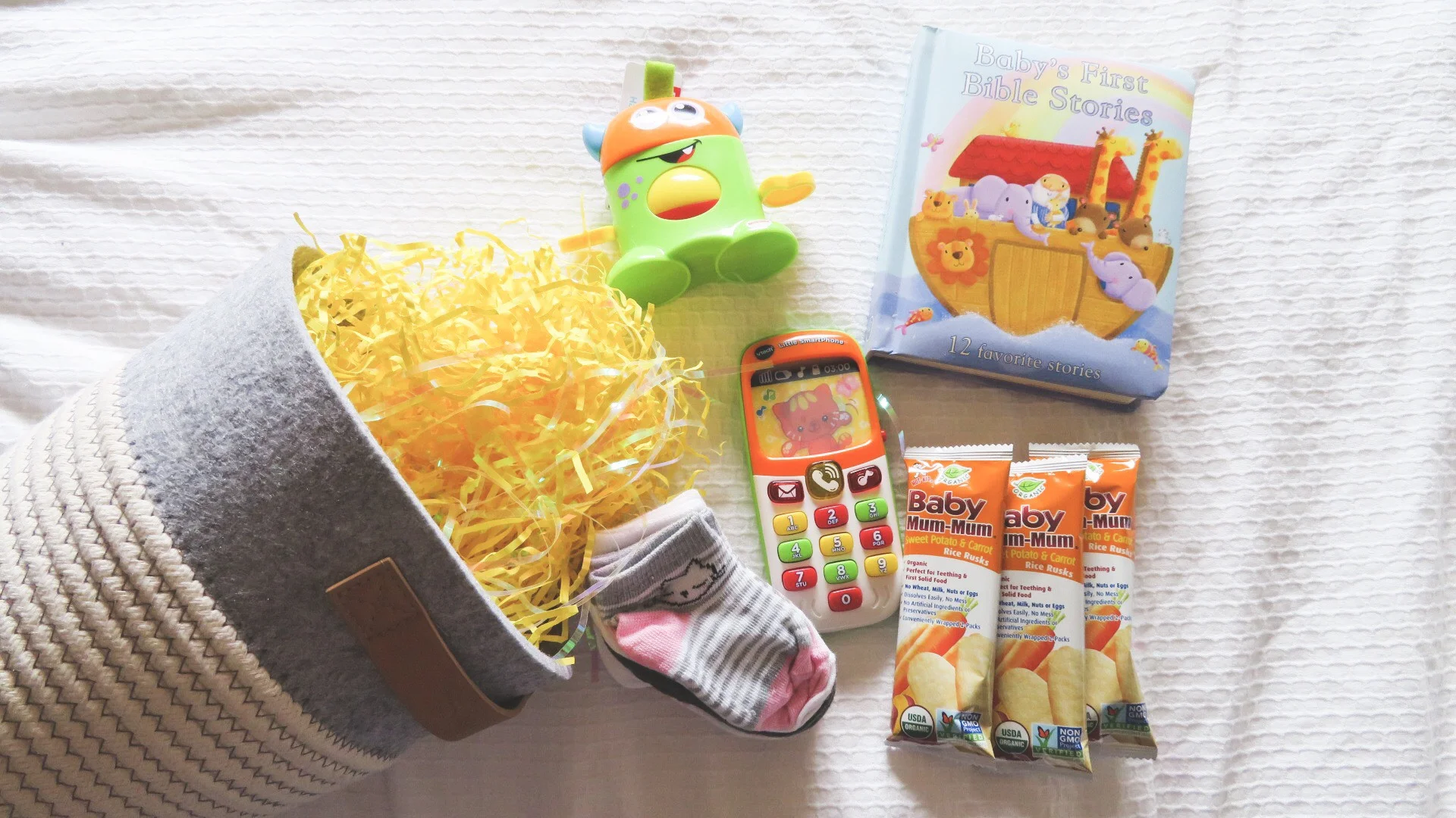 Addie’s basket holds a Bible story book, a little monster toy, a light up phone, new socks, and a couple of her favorite snacks.